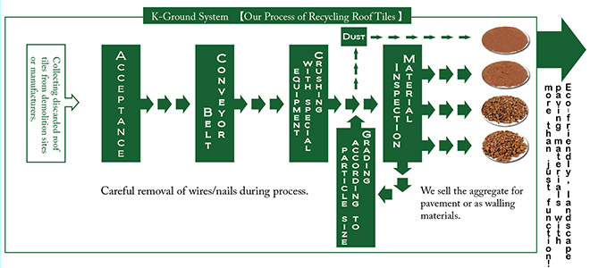 The above process is indispensable for recycling roof tiles. Every step is necessary to manufacture good quality pavement materials. Based on this process, ECO SYSTEM is providing a total business package, including instructions on accepting discarded roof tiles, and installations and sales of landscape pavement materials or building material products. The followings are what we can provide you with.