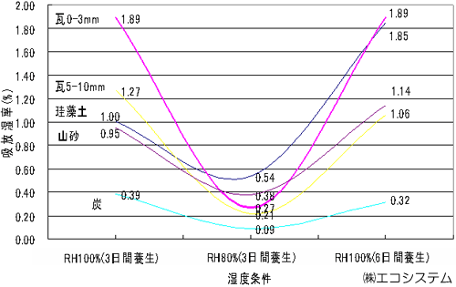 This graph shows that Kawarakabe releases and absorbs as much or more moisture as diatomite, which proves its suitability as plastering material. When the humidity is RH100% (See bottom left of the graph), roof tiles absorb more moisture than other materials. As the humidity nears RH80% (Also see the center of the graph), they release a lot of moisture. This explains the roof tiles’ high functionality. *The original data has been collected in The Industrial Research Institute of Ishikawa and converted into tons per cubic meter (kg/m3).